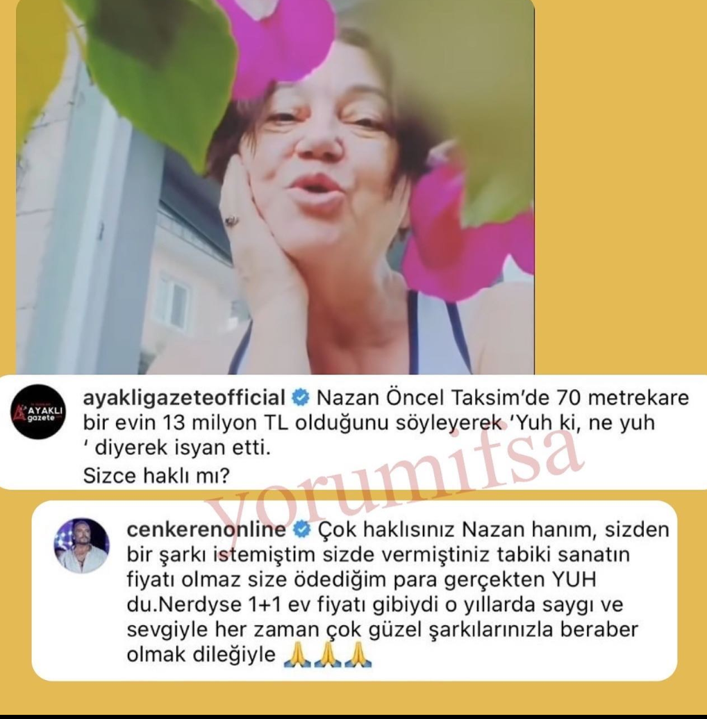 Başarılı şarkıcı Cenk Eren’de Nazan Öncel’e ev fiyatlarından destek yanıtı verdi. Ancak Cenk Eren’in Nazan Öncel’e sitemi de dikkat çekti.