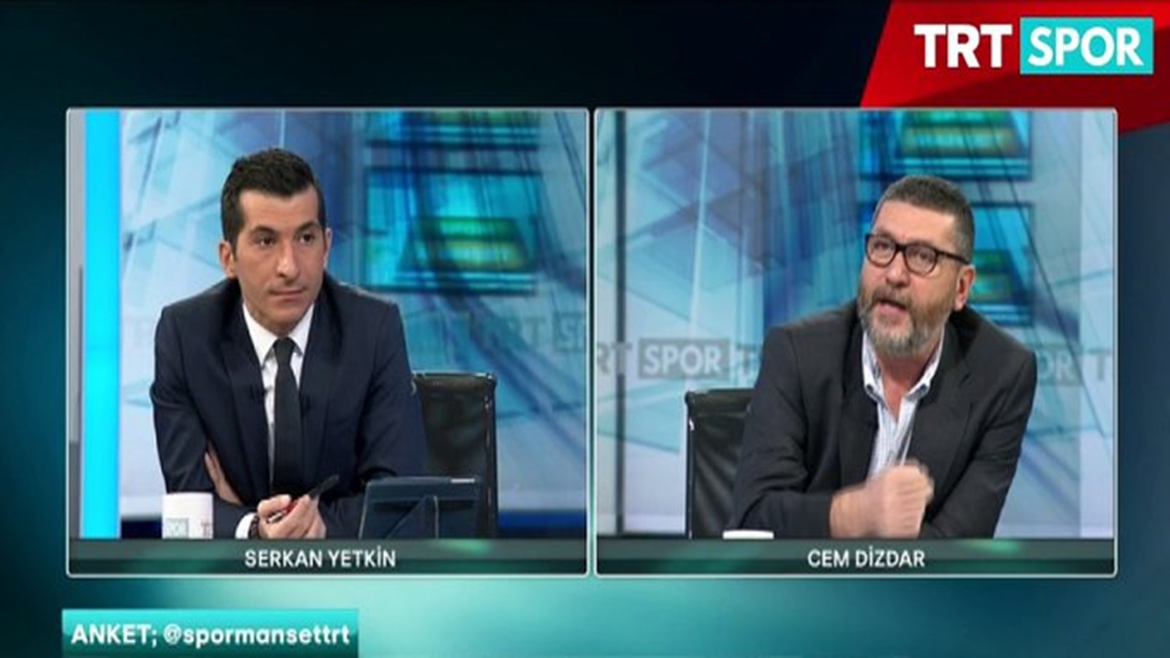 TRT Spor’un canlı yayınında kavga çıktı. Spor Manşet programında canlı yayında yaşanan kavga gündeme bomba gibi düştü. Programın sunucusu Serkan Yetkin, yorumcu Cem Dizdar’a sorduğu sorunun cevabı karşısında adeta çılgına döndü. Yaşanan kavga spor manşetlerinin de üst sıralarında yerini aldı. Spor Manşet programında sunucu ve yorumcu arasında yaşanan kavga gündeme bomba gibi düştü. Yorumcu Cem Dizdar’a sorduğu soruya aldığı yanıt karşısında adeta çılgına dönen sunucu Serkan Yetkin, canlı yayında açtı ağzını yumdu gözünü. Sorulan bir soru üzerine çıkan kavga spor manşetlerinin de gündemine oturdu.
