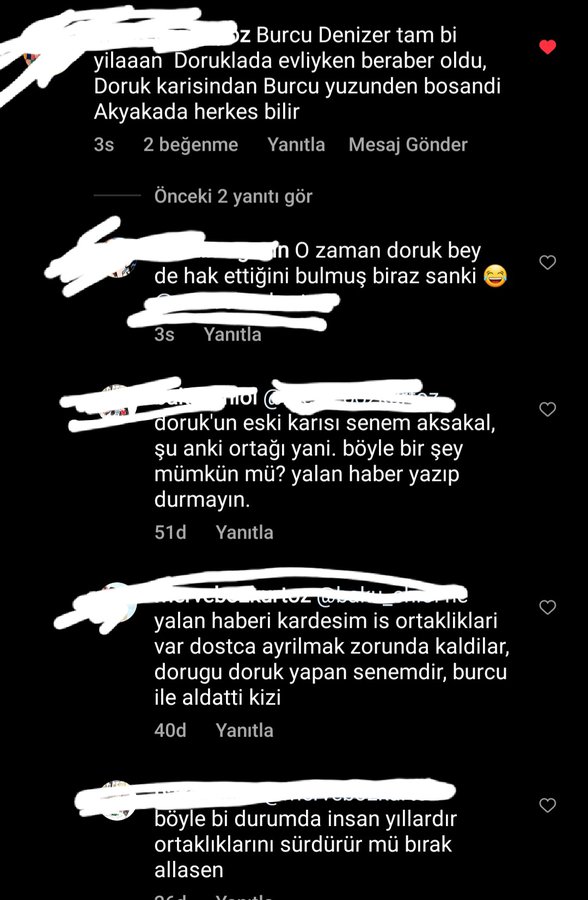 Magazin sayfalarına gelen bilgilerde ve sosyal medya yorumlarında Burcu Denizer’in daha önce de Doruk Tirman’ı karısı Senem Aksakal’dan ayırdığı iddia edildi. Yorumlarda Burcu Denizer için “Burcu Denizer’in daha önce de Doruk, Senem ile evliyken Doruk ile beraber olup evliliklerini bitirdiğini herkes bilir.” yorumu ağızları açık bıraktı.