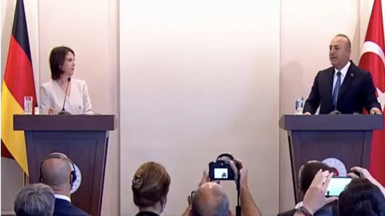 Ortak basın toplantısında konuşan Dışişleri Bakanı Mevlüt Çavuşoğlu, ‘Her şeyden önce Suriye’de biz tüm terör örgütlerine karşı mücadele verdik, şehitler verdik.’ dedi ve ‘DEAŞ’la mücadele etmek istiyorsanız sahaya inersiniz’ ifadelerini kullandı. Uluslararası hukukun önemine vurgu yapan Bakan Çavuşoğlu, ‘Sayın Baerbock şimdi Yunanistan’dan geldi. 14 senedir orada yaşayan Türk azınlığın hakları hakkında kararlar uygulanmıyor. Gelelim Norveç’e. Çocuklara ilişkin sosyal haklara ilişkin Avrupa İnsan Hakları Mahkemesi kararları uygulanmıyor. AİHM kararlarını Yunanistan’a hatırlatmazken niye sürekli Kavala konusunu gündeme getiriyorsunuz? Çünkü Kavala’yı Türkiye aleyhine kullanıyorsunuz. Bu konularda çifte standarda düşmeden, hukuk çerçevesinde biz Türkiye olarak konuşmaya hazırız. Ben Tahran’daki buluşma ile ilgili şunu beklerdim, Türkiye’nin Putin ile görüşmesinden sonra tahıl ihracının önündeki engelin kaldırıldığı vurgusunun yapılmasını beklerdim.’ dedi.