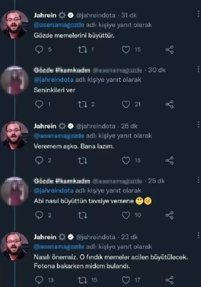 Jahrein kullanıcı isimli Ahmet Sonuç, sosyal medya hesabından yaptığı paylaşımlarla gündem olmaya devam ediyor. Bu defa Twitter’da bir kadın takipçisi ile yaşadığı diyalog gündeme bomba gibi düşen Jahrein, kadını hem taciz etti hem de hakaret dolu ifadeler kullandı. Jahrein, Twitter’da bir kadın takipçisine “Memelerini büyüttür” şeklinde bir yorum yaptı. Bunun üzerine de kadın takipçi, Jahrein’e “Seninkileri ver, abi nasıl büyüttün tavsiye versene” yanıtını verdi. Bu cevap sonrası söylediklerinde gaza basan Jahrein, “Nasılı önemsiz. O fındık memeler acilen büyütülecek. fotoğrafına bakarken midem bulandı” ifadelerini kullandı.