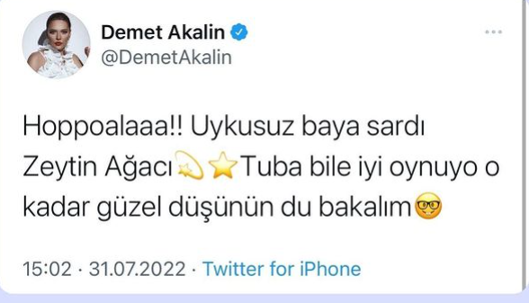 Tuba Büyüküstün’ün kötü oyuncu olduğuna konusunda Demet Akalın’da hem fikir oldu. Demet Akalın attığı tweette “Hoppolaa! Uykusuz baya sardı Zeytin Ağacı. Tuba bile iyi oynuyor o kadar güzel düşünün. Du bakalım” diye yazarak Tuba Büyüküstün’ün oyunculuğunun kötü olduğu yorumlarına katıldı.