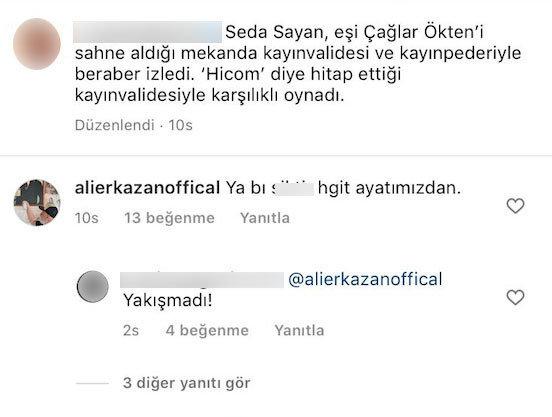 Magazin sayfaları Seda Sayan kendisinden 25 yaş küçük 7. eşini kayınvalidesi ve kayınpederiyle birlikte izlemeye gittiğini, konserde kayınvalidesine Hicom diye hitap etmesini ve karşılıklı göbek atmasını paylaşmıştı. Ali Erkazan’da o magazin Instagram sayfalarından birinin bu haberinin altına ”Ya bi s…. git hayatımızdan” yorumunda bulundu.