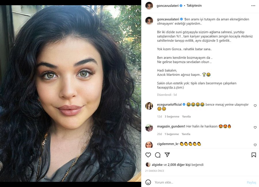 Gonca Vuslateri instagram hesabından faceapp uygulamasından yüzüne estetikli gibi bir filtre uyguladığı fotoğrafı paylaşıp göndermeli bir not yazdı. Gonca Vuslateri’nin hangi kadın oyuncuya laf attığı merak edildi.
