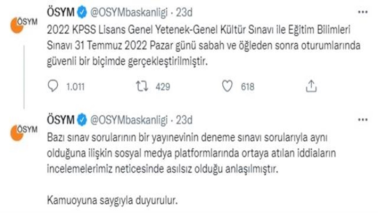 Gündem olan iddiaların ardından gözler ÖSYM’ye çevrildi. KPSS sınav sorularının sızdırıldığına dair iddialarıyla ilgili ÖSYM’den ilk açıklama geldi. Gelen yoğun tepkilerin ardından ÖSYM’nin resmi sosyal medya hesabından bir açıklama yapıldı ve söz konusu açıklamada, ‘2022 KPSS Lisans Genel Yetenek-Genel Kültür Sınavı ile Eğitim Bilimleri Sınavı 31 Temmuz 2022 Pazar günü sabah ve öğleden sonra oturumlarında güvenli bir biçimde gerçekleştirilmiştir. Bazı sınav sorularının bir yayınevinin deneme sınavı sorularıyla aynı olduğuna ilişkin sosyal medya platformlarında ortaya atılan iddiaların incelemelerimiz neticesinde asılsız olduğu anlaşılmıştır. Kamuoyuna saygıyla duyurulur.’ ifadelerine yer verildi.