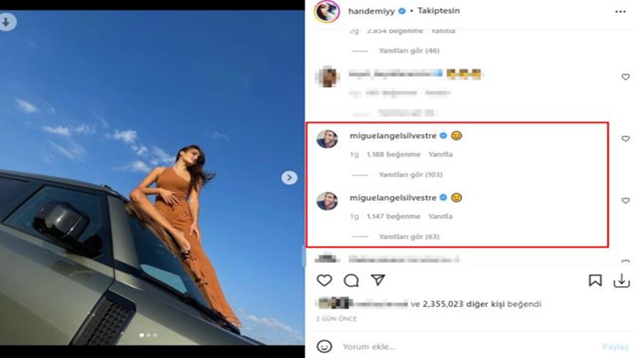Oyunculuğu kadar özel hayatıyla da sık sık gündeme gelen Hande Erçel, aşk hayatıyla da sık sık magazin manşetlerinin en üst sıralarında yer alıyor. Dünyaca ünlü oyuncu Miguel Angel Silvestre’nin Instagram’dan takip etmeye başladığı güzel oyuncu bir kez daha magazin gündemindeki yerini aldı. Erçel’e kafayı takan Silvestre, paylaşımlara yorum yapmayı da ihmal etmedi.