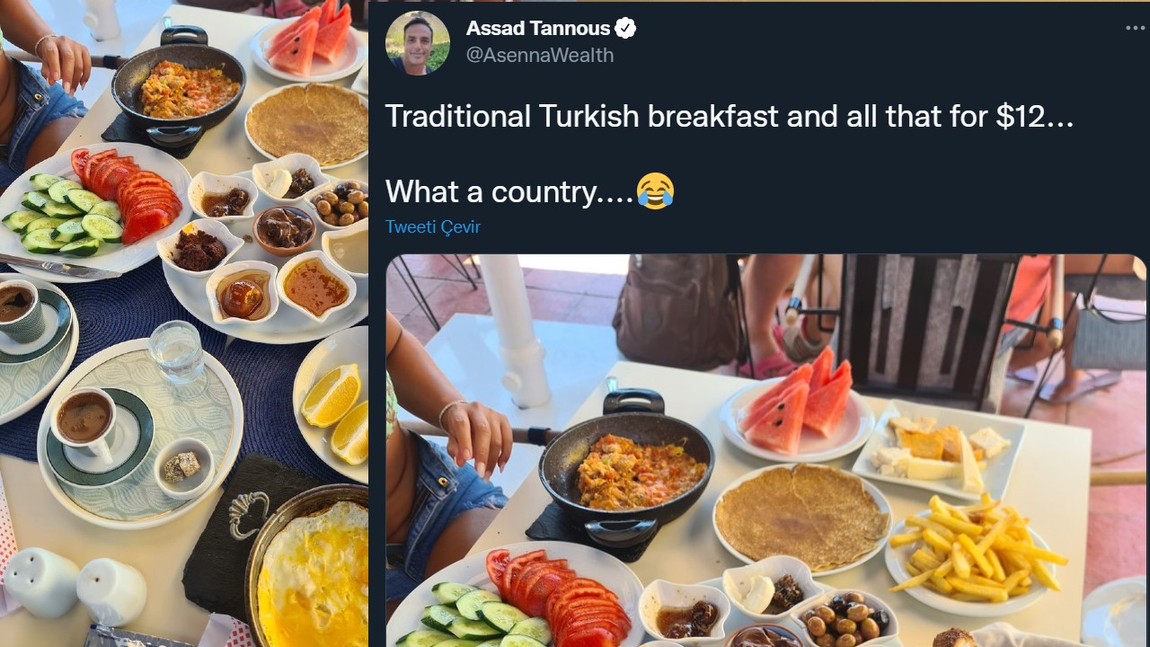 Tannous adlı yabancı turist yedikleri kahvaltı fotoğrafını paylaşıp “Traditional Turkish breakfast and all that for $12… What a country.. (Geleneksel Türk kahvaltısı ve tüm bunlar sadece 12 dolara… Ne ülke ama..) diye yazdıp kahkaha emojisi koydu.