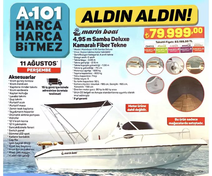 A101 marketler zincirinde yaklaşık 80 bin TL’ye tekne satılacağı yayımlandı. A101 broşürlerinde 80 bin TL değerindeki tekne gündem oldu.
