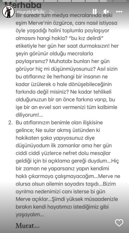 Ünlü popçu Murat Dalkılıç sosyal medyada kendisi ve eski eşi Merve Boluğur’un biten evliliğinin ardından yapılan yorumlara tepki göstredi.