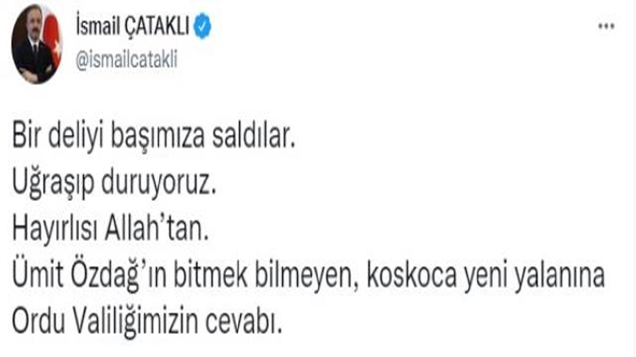 Özdağ’ın 8 milyon iddiası karşısında sessiz kalmayan İçişleri Bakan Yardımcısı İsmail Çataklı ise sosyal medya üzerinden çok konuşulacak bir paylaşımda bulundu. Ordu Valiliği’nden gelen açıklamayı alıntılayan Çataklı, ‘Bir deliyi başımıza sardılar. Uğraşıp duruyoruz. Hayırlısı Allah’tan. Ümit Özdağ’ın bitmek bilmeyen, koskoca yeni yalanına Ordu Valiliğimizin cevabı.’ notunu düştü. Çataklı’nın bu paylaşımının ardından gözler Ümit Özdağ’a çevrildi.
