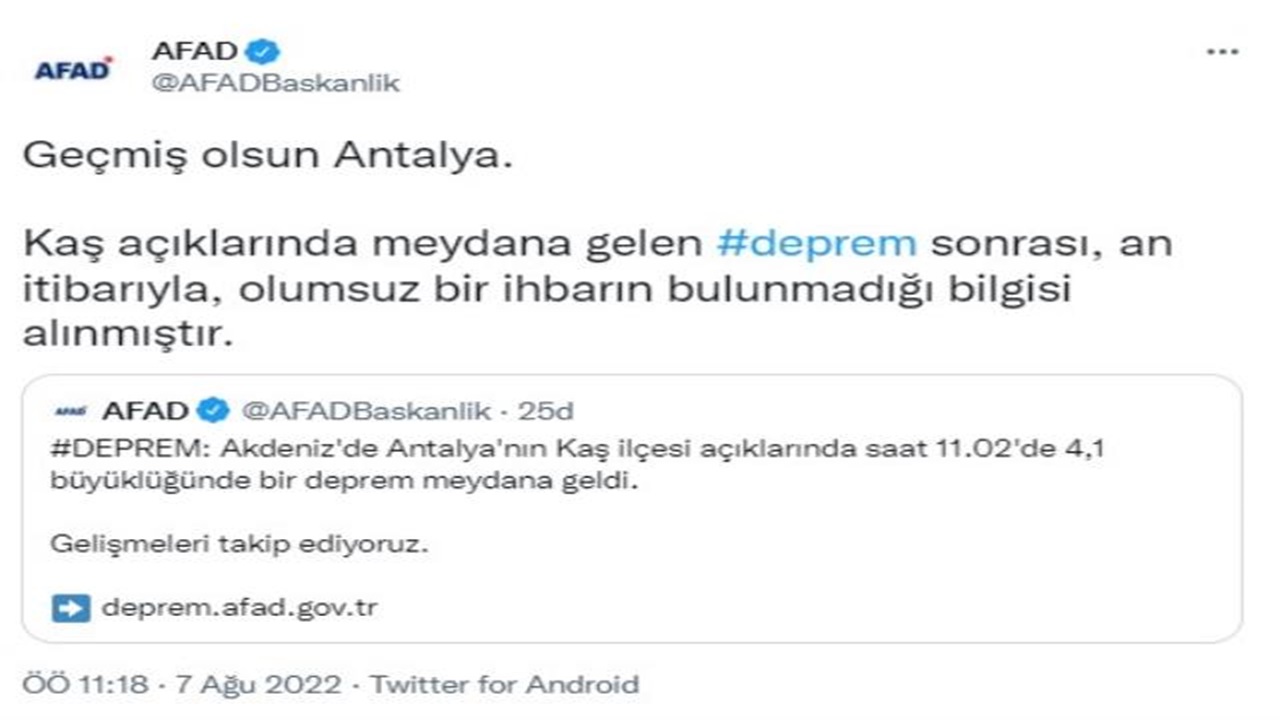 Antalya’nın Kaş ilçesinde meydana gelen depremle ilgili detaylı bilgilendirmeye yer veren AFAD, depremin şiddetini 4.1 olarak paylaştı. Depremle ilgili paylaşımlarına devam eden AFAD, ‘Geçmiş olsun Antalya. Kaş açıklarında meydana gelen deprem sonrası, an itibarıyla, olumsuz bir ihbarın bulunmadığı bilgisi alınmıştır.’ denildi.