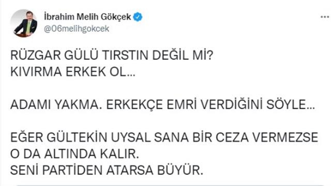 Milletvekili Cemal Enginyurt’un bu açıklamasının ardından eski Ankara Büyükşehir Belediye Başkanı Melih Gökçek’ten çok sert bir paylaşım geldi. Enginyurt’un sosyal medya hesabı üzerinden yaptığı açıklamayı alıntılayan Gökçek, ‘Rüzgar gülü tıstın değil mi? Kıvırma, erkek ol… Adamı yakma. Erkekçe emri verdiğini söyle. Eğer Gültekin Uysal sana bir ceza vermezse o da altında kalır. Seni partiden atarsa büyür.’ ifadelerini kullandı.