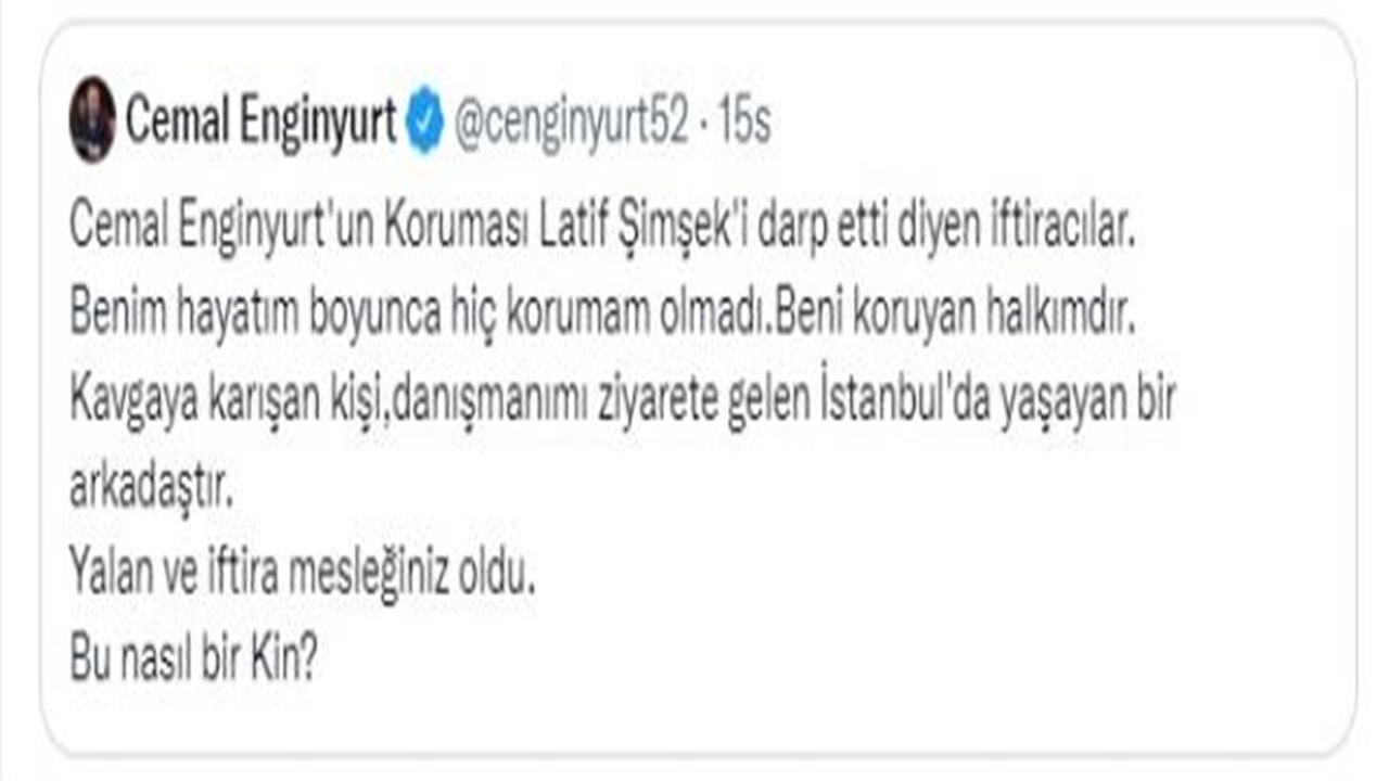 Yaşanan olayın ardından yanındaki şahsın koruması olduğuna dair iddialara yanıt veren Cemal Enginyurt, ‘Cemal Enginyurt’un koruması Latif Şimşek’i darp etti diyen iftiracılar. Benim hayatım boyunca korumam olmadı. Beni koruyan halkımdır. Kavgaya karışan kişi danışmanımı ziyarete gelen İstanbul2da yaşayan bir arkadaştır. Yalan ve iftira mesleğiniz oldu. Bu nasıl bir kin?’ ifadelerini kullandı.