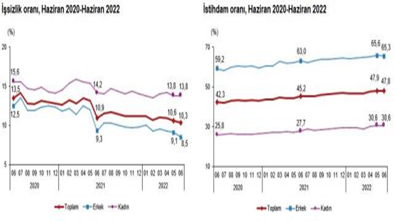 Haziran 2022 dönemine ait iş gücü istatistiklerini açıklayan TÜİK verilerine göre, Türkiye’de işsizlik oranı yüzde 10,3 oldu. İşsiz sayısı 136 bin kişi azalarak 3 milyon 541 bin kişi oldu. İşsizlik oranı erkeklerde yüzde 8,5 olarak kaydedilirken kadınlarda ise yüzde 13,8 olarak tahmin edildi.