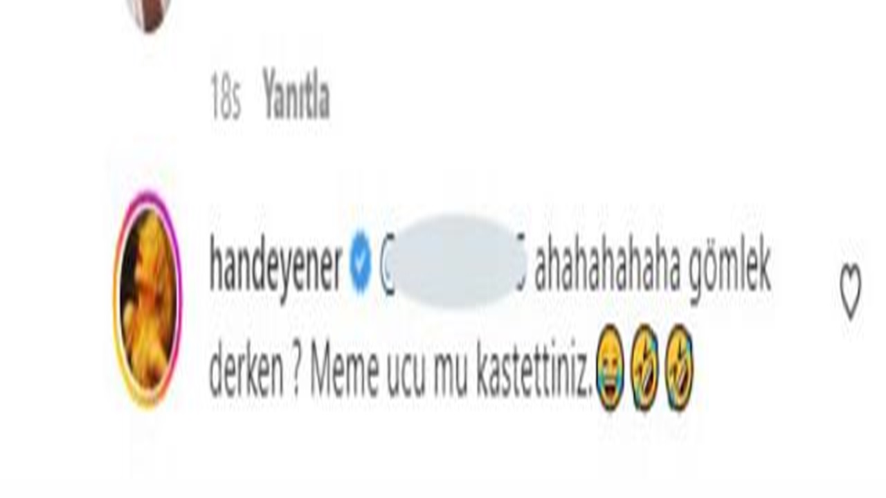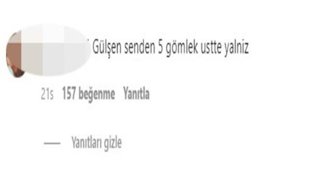 Bir sosyal medya kullanıcısı ise birbirleriyle kıyaslanan iki ünlü şarkıcıdan Hande Yener için ‘Gülşen senden 5 gömlek üstte yalnız’ yorumunu yaptı. Bu yoruma olay yaratan bir cevap veren Hande Yener ise ‘Gömlek derken, meme ucu mu kastettiniz?’ şeklindeki yanıtıyla gündeme bomba gibi düştü.