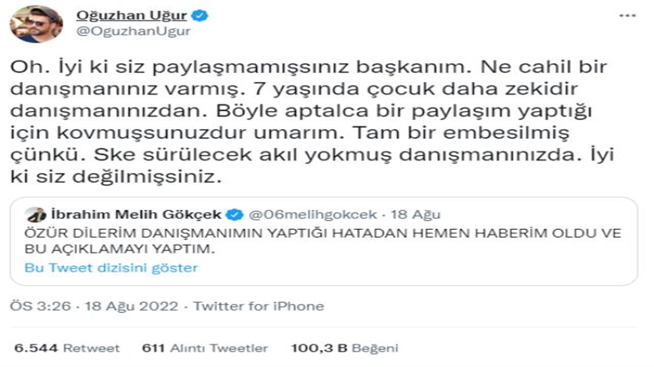Sosyal medyanın diline düşen Melih Gökçek, paylaşımı danışmanının yaptığını söylemiş ve özür dilemişti. Eski asker Hasan Atilla Uğur’un oğlu YouTuber Oğuzhan Uğur, Gökçek’in özür dilediği paylaşımı alıntılayarak kendisine çok ironik bir yanıt verdi. Uğur, ‘Oh. İyi ki siz paylaşmamışsınız başkanım. Ne cahil bir danışmanınız varmış. 7 yaşındaki çocuk daha zekidir danışmanınızdan. Böyle aptalca bir paylaşım yaptığı için kovmuşsunuzdur umarım. Tam bir embesilmiş çünkü. Ske sürülecek akıl yokmuş danışmanınızda. İyi ki siz değilmişsiniz.’ ifadelerini kullandı.