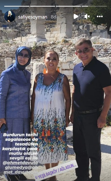Burdur’da Sagalassos’ta gezi sırasında eski başbakan Ahmet Davutoğlu ile karşılaşan Safiye Soyman, o anları sosyal medya hesabından paylaştı. Safiye Soyman’ın paylaştığı fotoğrafta Gelecek Partisi Genel Başkanı Ahmet Davutoğlu ve eşi Sare Davutoğlu yer aldı. Soyman paylaşımında ”Burdur’un tarihi Sagalassos’ta tesadüfen karşılaştık. Çok mutlu oldum.” ifadelerine yer verdi.