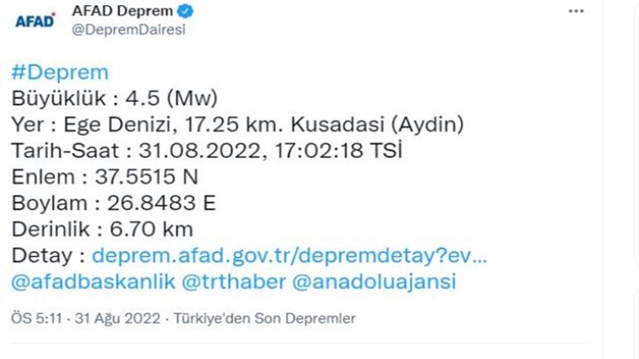 Kuşadasında meydana gelen üçüncü depremle ilgili açıklama yapan AFAD, depremin büyüklüğünü 4.5 olarak aktardı. Saat 17.02’de meydana geldiği kaydedilen depremin derinliği ise 6.70 olarak ölçüldü.