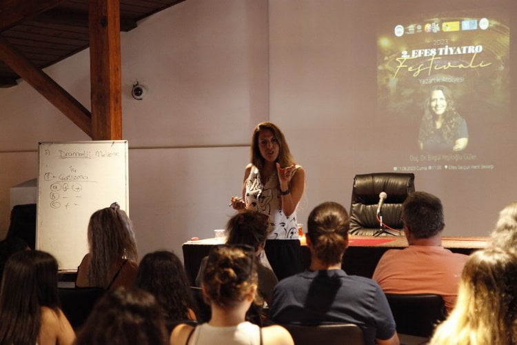 İZMİR (İGFA) – 8- 11 Ağustos tarihleri arasında Efes Selçuk’u tiyatro ile buluşturan 2. Efes Tiyatro Festivali’nin son gününde Selçuk Efes Kent Belleği’nde düzenlenen Yazarlık Atölyesi’nde Doç. Dr. Birgül Yeşiloğlu Güler katılımcılara yazma sürecini, tiyatro oyun metni yazarken dikkat edilmesi gereken unsurları anlattı.