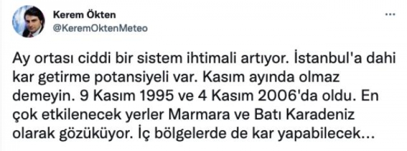 Ökten’in paylaşımı şu şekilde; “Ay ortası ciddi bir sistem ihtimali artıyor. İstanbul’a dahi kar getirme potansiyeli var. Kasım ayında olmaz demeyin. 9 Kasım 1995 ve 4 Kasım 2006’da oldu. En çok etkilenecek yerler Marmara ve Batı Karadeniz olarak gözüküyor. İç bölgelerde de kar yapabilecek.”