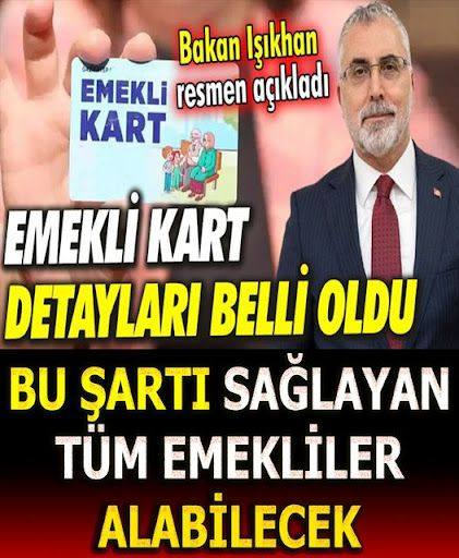 Emekli Kart ile ilgili son bulgular, Çalışma ve Sosyal Güvenlik Bakanı Vedat Işıkhan, tarafından canlı yayında duyuruldu. Milyonlarca emeklinin merakla beklediği Emekli Kart ile ilgili son bulgular, Çalışma ve Sosyal Güvenlik Bakanı Vedat Işıkhan, tarafından canlı yayında duyuruldu.Emekli Kart, emeklilere sunulacak özel bir kart olup, indirimlerden, faydalardan ve özel hizmetlerden faydalanma imkanı sağlayacak. EMEKLİ KART İLE SAĞLANACAK AVANTAJLAR Vedat Işıkhan, Emekli kart ile birlikte sağlanacak faydaları şöyle duyurdu;Gençlik ve Spor Bakanlığı tesislerine ücretsiz giriş imkanı Kamuya ait konukhane, öğretmenevi, sosyal tesis ve konuk evlerinde %15 indirim PTTcell tarafından özel emekli paketi PTT Kargo’da özel emekli indirimi TCDD Dbuyrukyolları ana hat trenlerinde %10 indirim TROY ile bankalar aracılığı ile fatura ödemelerinde, eczane ve market harcamalarında, giyim mağazalarında indirimler Haberleşme, ulaşım, zincir marketler ve online pazar yerlerinde uyuşmalar BAKAN IŞIKHAN’IN HEDEFİ Işıkhan ana hedefini ise şöyle dile getirdi: “Bu yeni SGK hizmet modelimiz ile emeklilerimizin topluma aktif olarak katılabildiği, sosyal hayatın ortamında bulunduğu bir sistemi amaçlıyoruz.” EMEKLİ KART’A NASIL SAHİP OLUNUR? Emekli Kart’a dair ayrıntılar önümüzdeki devrede emekli danışmanları, iletişim vasıtaları ve platformlar aracılığı ile emeklilere bildirilecek. Işıkhan son olarak, “Daha sağlıklı bir emeklilik devrei hedefiyle birlikte çalışmaya devam edeceğiz” dedi..