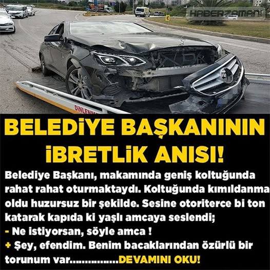 Oooo amca‚ her gelenin bir talebi var. Belediye boş mu duruyor sanıyorsun. Çoğu yerin kaldırımı bile yok‚ önce onlarla uğraşmalıyız. Hele bir eskisi şekliyle tüm kaldırımları bitirelim‚ birkaç sene sonra da ek bütçe olursa‚ kaldırım girişlerine baktırırız. Öyle he demeyle olmaz her iş. – Ama birkaç sene demek‚ torunumun ve onun gibi yaşamak zorunda olanların‚ en güzel çağlarını evde hapis geçirmesi demek. – Bak amca‚ ben koskoca belediye başkanıyım. Herkese bu kadar vakit ayırırsak işimiz var. O sırada başkanın yardımcısı telaşlı bir halde içeri girdi; – Efendim trafikten aradılar ! Noldu büyük bir kaza mı olmuş? Çok ölen mi olmuş‚ nedir bu telaşın? – Bir çocuğa araba çarpmış. Başkan sakinleşerek‚ koltuğuna doğru adım attı. Ne yapayım yahu‚ her kazaya belediye başkanı mı koşacak. Amca sen de çık artık. Görüyorsun işlerimiz var. İhtiyar adam‚ boynu bükük dışarı yürüdü. Başkanın yardımcısı devam etti; – Efendim‚ çocuk‚ çocuk sizin torununuzmuş. Belediye başkanı‚ sendeleyerek koltuğuna oturdu. Gözünün önünde önce torununun gülen yüzü canlandı‚ sonra da tekerlekli bir sandalyede ağlayışı. Titrer gibi bir sesle; – Az önce çıkan ihtiyarı çağırın çabuk. İhtiyar adam kapının önündeki koltukta başı önde oturuyordu. Çağrılınca içeri biraz heyecan‚ biraz çekingenlikle girdi; – Buyurun. – Amca‚ söz veriyorum kaldırımları yaptıracağım ama ne olur beddua ettiysen geri al. – Kırıldım ama beddua etmedim. – Nolur o zaman‚ torunum için dua et. O esnada telefon çaldı‚ başkanın uzanmayacağını anlayan yardımcısı telefonu açtı‚ sonra başkana uzattı; – Kızınız arıyor efendim. Kötü haber bekleyen başkan‚ dudaklarını ısırarak konuştu; – Aaa..aloo Baba‚ az önce kızıma araba çarptı ama… – Eee evet‚ durumu nasıl? babacakları – Merak etme‚ sadece burnu kanamış. Biz hastanedeyiz‚ duyar da merak edersin diye aradım. Başkan ağlayışı duyulmasın diye hızla kapattı telefonu. Yardımcısı diğer telefonu uzattı;…….