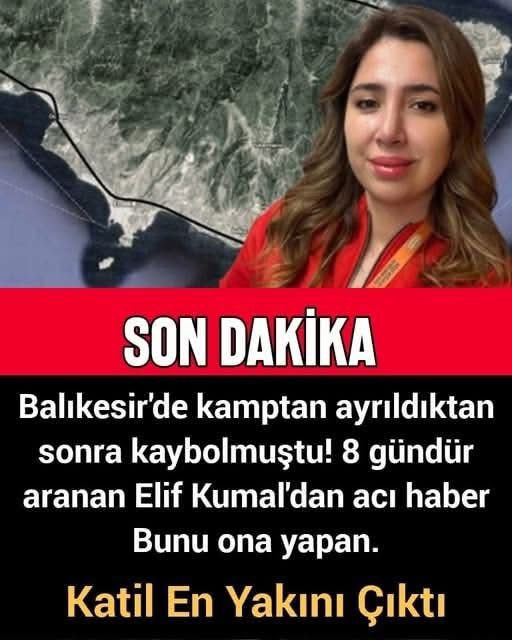 Ormanlık alan ve gölet çevresini tarayan ekipler, Kumal’ın aracına ait olduğu değerlendirilen bir karter koruma parçası bulmuştu. Elif Kumal’ın erkek arkadaşı Enis G. ise gözaltına alınmıştı. E.G.’nin yüzünde tespit edilen tırnak izleri şüphe oklarını kayıp Elif’in erkek arkadaşına çevirmişti. 8 gün sonra ilk iz! Kayıp Elif Kumal’ın son görüntüsü ortaya çıktı Elif Kumal’ı arama çalışmaları 8. günde de devam ederken ağabeyi İbrahim Kumal, dikkat çeken iddialarda bulunmuş kardeşinin sevgilisinin öldürdüğünü öne sürmüştü. CANSIZ BEDENİ BULUNDU 41 araç, 11 dron ve 414 kişiyle dağdaki patika yollarda araçla ve yaya olarak inceleme yapan ekipler, Kumal’a ulaşmak için bölgedeki tavuk çiftliklerini, depoları, sazlık alanları, dereleri ve çok sayıda noktayı araştırdı. Jandarma dalgıçları, gölete dalış yaparak Kumal’a ait iz bulmaya çalıştı. GÜNÜN ÖZETİ Termal sonar arama cihazı, dron ve iz takip köpeklerinin de kullanıldığı çalışmalara, bölgeyi bilen off-road ekipleri de destek verdi. Fırtınanın etkili olduğu bölgede, Bandırma’nın Edincik, Erdek’in Tatlısu, Ormanlı ve Ballıpınar Mahallelerinin üst bölgelerine de ekipler sevk edildi. Akşam saatlerinde Yukarıyapıcı Göleti’ne dalış yapan ekipler, Kumal’ın kullandığı otomobili suyun altında tespit etti. Ekiplerce araçtan çıkarılan Kumal’ın hayatını kaybettiği belirlendi. Kumal’ın cesedi, otopsi için Bursa Adli Tıp Kurumu morguna gönderildi. Bu arada otomobilin göletten çıkarılması için daha sonra çalışma yapılacağı öğrenildi.
