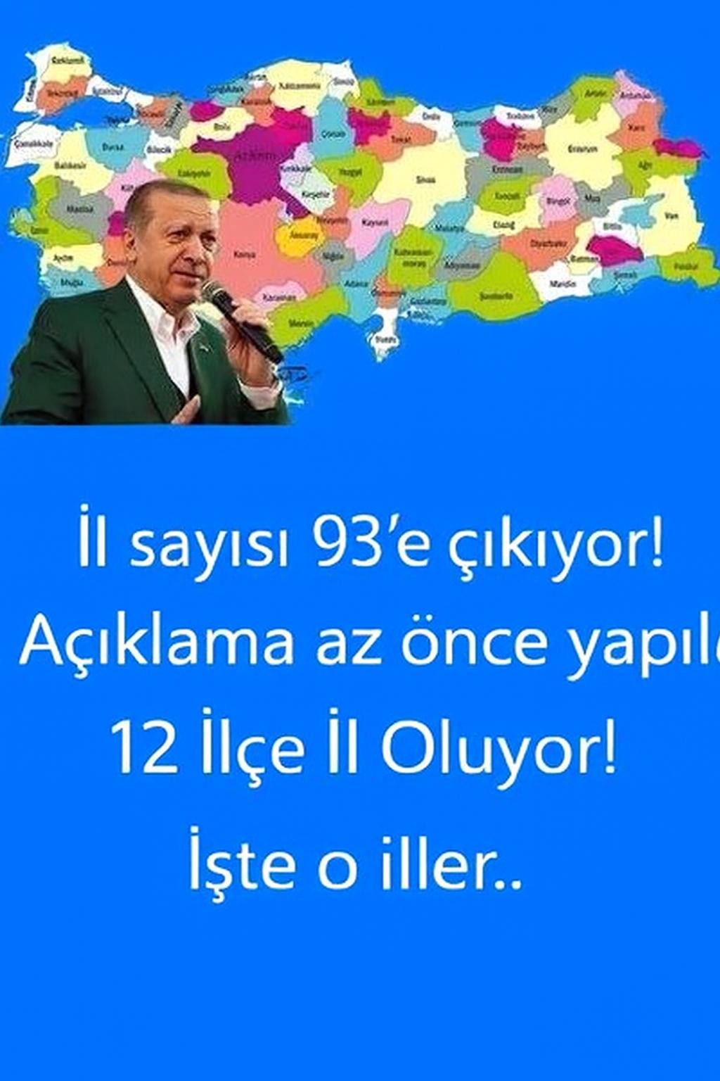 Pösteki, ayrıca il olmasını bekledikleri 12 ilin adını ve nüfus sayısını da takipçileriyle paylaştı. İşte o ilçeler: • Aydın – Nazilli: 160.581 • Muğla – Bodrum: 187.284 • Mersin – Tarsus: 347.314 • Şırnak – Silopi: 141.621 • Bursa – İnegöl: 286.848 • Balıkesir – Bandırma: 161.894 • Adana – Ceyhan: 159.955 • Ankara – Polatlı: 127.526 • Hakkari – Yüksekova: 119.194 • Konya – Ereğli: 149.333 • Antalya – Alanya: 350.636 • Tekirdağ – Çorlu: 284.907 • İL SAYISININ 100’E ÇIKACAĞI ÖNE SÜRÜLMÜŞTÜGeçtiğimiz aylarda da AK Parti Genel Başkan Yardımcısı Vedat Demiröz konuyla alakalı bir açıklama yapmış ve “Cumhurbaşkanı yerleşkesinin yanında bazı yeni yerleşkeler ve misafirhaneler yapıyoruzAhlat’ta bundan sonra dünya başkenti gibi dünya liderleri toplanıp, dünyanın sorunlarını görüşecek bir kent haline geleceğiz.Bunu büyüklerimiz açıklayacak. Devlet Bahçelinin önerisi ve Cumhurbaşkanımızın beraber verdiği kararla Türkiye’nin il sayısının 100’e çıkacağı bir zamanda inşallah Ahlat’ımızı da bu şehirler arasına alacağız. Buna da bürokrasi olarak hazırlıklı olalım. Bu müjdeyi de bu güzel şenlikte ifade edeyim” demişti. Demiröz daha sonra Ahlat’ta yaptığı konuşmanın yanlış anlaşıldığını söyleyip; “Bugün Ahlat’ta yaptığım konuşma, bazı yayın organlarında ‘İl sayısı 100’e çıkarılacak’ şeklinde yanlış yansıtılmıştır. Bu hususta verilmiş bir karar yoktur. Oysaki konuşmamda; ‘Türkiye’nin şehir sayısının 100’e çıkarılması halinde Ahlat’ın bunların arasında yer alacağı’ temennisidir.” ifadelerini kullanmıştı