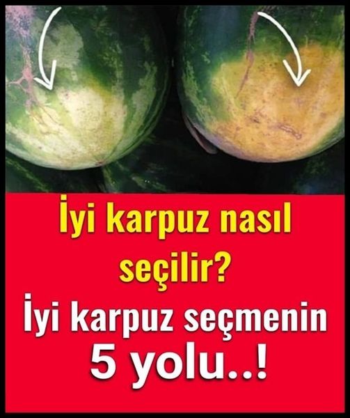1.HAFİF ÇATLAKLAR Karpuzun üzerinde örümcek ağını andıran hafif çatlaklar olması onun olgun ve lezzetli olduğunu gösterir. 2.SARI ALTLARKarpuzun altında yer alan sarılıklar onun kötü olduğunu değil iyi olduğunu gösterir. Sarı alanın geniş olması ise karpuzun daha da iyi olduğunu gösterir.3. AĞIRLIK Seçtiğiniz karpuz boyutlarına göre ağır olmalıdır. Çok büyük ya da çok küçük değil orta boyda ve boyutlarına göre ağır yapıda olmalıdır. 4.KARPUZUN YAPISI Oval ve uzun yapılı erkek karpuz olarak bilinir ve sulu olur. Yuvarlak karpuzlar ise dişi olarak bilinir ve lezzetli olur.5.SAP KISMI Karpuzun sapı olgun ve kuru olmalıdır. Yeşil ve tazeyse o karpuz yeterince olgun değil demektir.