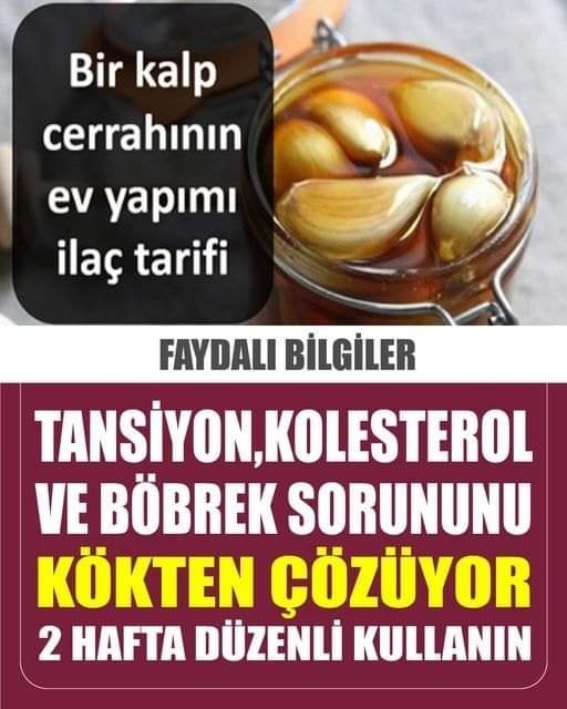 BİR KALP CERRAHININ EV YAPIMI REÇETESİ YÜKSEK TANSİYON İÇİN Sarımsak kesinlikle en iyi doğal ilaçlardan biridir. Güçlü sebze antibakteriyel, antiseptik ve antifungal özelliklere sahiptir ve nerede ise her insanın mutfağında bulunur. Çoğunlukla onu yemeklerimiz için lezzetlendirici olarak kullanıyoruz, ancak bir sarımsak şurubu hazırlamak sayısız ciddi hastalıklarla savaşmanın mükemmel bir yoludur. Şurup ayrıca sarımsak yanında zencefil ve limon da içerir. Her iki bileşen de sağlığımız için sayısız avantaja sahiptir ve vücudunuzu enfeksiyonlardan ve öteki sağlık problemlerinden koruyabilir. Güçlü şurup, soğuk idraknlığı ve grip, öteki bakteriyel ve viral enfeksiyonların yanı sıra gut yada artrit gibi inflamatuvar durumlar için mükemmel bir çözümdür. 3 bileşenin hepsi de genel sıhhat durumunuzu iyileştiren ve çeşitli hastalık ve koşulları tedavi edecek güçlü bileşikler ,önemli vitaminler ve mineraller içerir. ŞURUBU NASIL HAZIRLANIR MALZEMELER 4 tane limon 4 cm zencefil kökü 4 diş sarımsak 2 litre su HAZIRLANIŞI Zencefil, sarımsak ve limonları iyice yıkayın, hepsini parçalamadan önce soyun. Onları bir yiyecek kaşığı su ile blenderda karıştırın. İyice karıştığına kesin olunca bir tencereye alın. İki litre suyu yavaş yavaş ekleyin. Buğu çıkana kadar kaynatın. Kaynadıktan sonrasında ocaktan alın ve soğumaya bırakın.Cam şişelere bölüştürüp, buzdolabında muhafaza edebilirsiniz. Sabahları aç karnına 2 yemek kaşığı ve uyumadan iki saat önce 2 yiyecek kaşığı olmak üzere günde 4 yiyecek kaşığı tüketin. Kardiyo sağlığınızı kontrol altında tutmak için arterlerinizi mutlaka temizleyecektir. Buna ek olarak tansiyonunuzu da belli bir seviyede tutmak için muhteşem bir ilaçtır. Bu karışımın tansiyonu düşürmesinin yanı sıra gripten korumada da çok faydalıdır.. Bu şekilde, yüksek tansiyon rahatsızlığı yaşayan kişilerde, 2 hafta tertipli kullanım ondan sonra kötü kolesterol değerlerinin düştüğü de görülmüş. Bu etkisini ise 2 hafta tertipli kullanımın ardından görebilirsiniz.