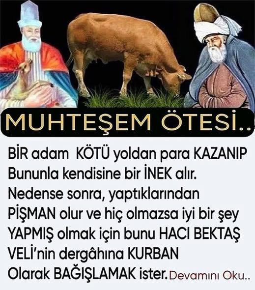 Bir adam kötü yoldan para kazanıp bununla kendisine bir inek alır Neden sonra, yaptıklarından pişman olur ve hiç olmazsa iyi bir şey yapmış olmak için bunu Hacı Bektas Veli’nin dergâhına kurban olarak bağışlamak ister. O zamanlar dergâhlar ayni zamanda aşevi işlevi görüyordur. Durumu Hacı Bektas Veli’ye anlatır ve Hacı Bektas Veli – ‘ helal değildir ‘ diye bu kurbanı geri çevirir. Bunun üzerine adam Mevlevi dergâhına gider ve ayni durumu Mevlana’ya anlatır . Mevlana ise ; bu hediyeyi kabul eder. Adam ayni şeyi Hacı Bektas Veli’ye de anlattığını ama onun bunu kabul etmemiş olduğunu söyler ve Mevlana’ya bunun sebebini sorar. Mevlana şöyle der: – Biz bir karga isek Hacı Bektas Veli bir şahin gibidir. Öyle her leşe konmaz. O yüzden senin bu hediyeni biz kabul ederiz ama o kabul etmeyebilir. Adam üşenmez kalkar Hacı Bektas dergâhı’na gider ve Hacı Bektas Veli’ye, Mevlana’nın kurbanı kabul ettiğini söyleyip bunun sebebini bir de Hacı Bektas Veli’ye sorar. Hacı Bektas da şöyle der: – Bizim gönlümüz bir su birikintisi ise Mevlana’nın gönlü okyanus gibidir. Bu yüzden, bir damlayla bizim gönlümüz kirlenebilir ama onun engin gönlü kirlenmez. Bu sebepten dolayı o senin hediyeni kabul etmiştir.” Böylesi incelik ve tevazu ile, birbirlerini yermek yerine yüceltebilmeyi becerebilenlerden olmamız dileğiyle…