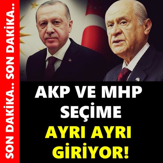 AKP ve MHP ayrı ayrı seçime katılacak.. Hükümete yakın yazar Abdulkadir Selvi’den Cumhur ittifakı için şaşırtan iddia.. Erken seçim tartışmaları devam ederken MHP ve AKP için flaş bir iddia ortaya atıldı. İddianın sahibi hükümete yakın bir yazar olunca doğruluğu da tartışma konusu olmadı. Hürriyet gazetesi yazarı Abdulkadir Selvi, bugünkü yazısında Cumhurbaşkanı Recep Tayyip Erdoğan’ın seçim startını vermek üzere olduğunu belirterek “Zaten Cumhur İttifakı’nın bir cumhurbaşkanı adayını belirleme sorunu yok. Erdoğan aday. Ayrıca AK Parti ve MHP seçimlere ayrı ayrı girecek. O nedenle milletvekili listeleri gibi bir sorun yaşamayacaklar” dedi. Öte yandan söz konusu iddia AKP ve MHP kaynakları tarafından da yalanlanmadı.